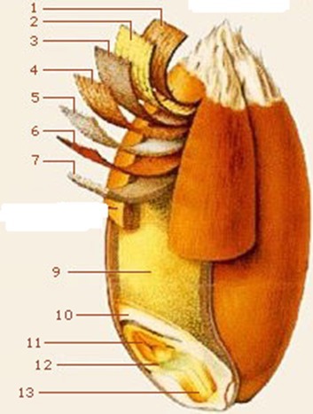 בשעורה יש חלוקה בין קליפה חיוצנה שיורדת לפני הטחינה לבין קליפה שנטחנת עימה. קליפת חיטה נאכלת קליפה חיצונית של שעורה אינה נאכלת.[37]