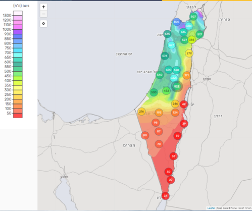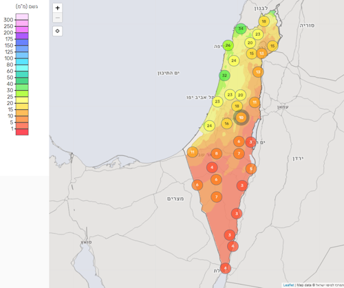 כמות המשקעים הממוצעת בארץ ב30 השנים האחרונות, ניתן להבחין בשוני הנרחב בין אזורי הארץ, במרחקים שאינם עולים על כמה עשרות ק"מ בודדים: