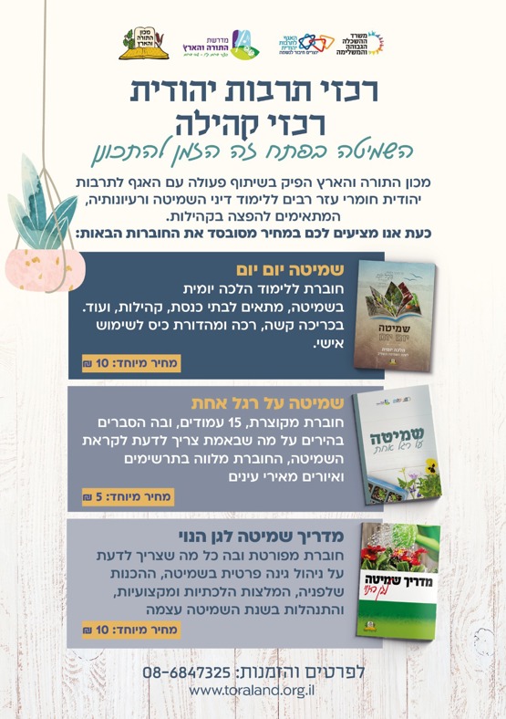במיוחד בשבילכם - במחיר מסובסד אנו מציעים לכם להזמין את החוברות: שמיטה יום יום, שמיטה על רגל אחת ומדריך שמיטה לגן הנוי.