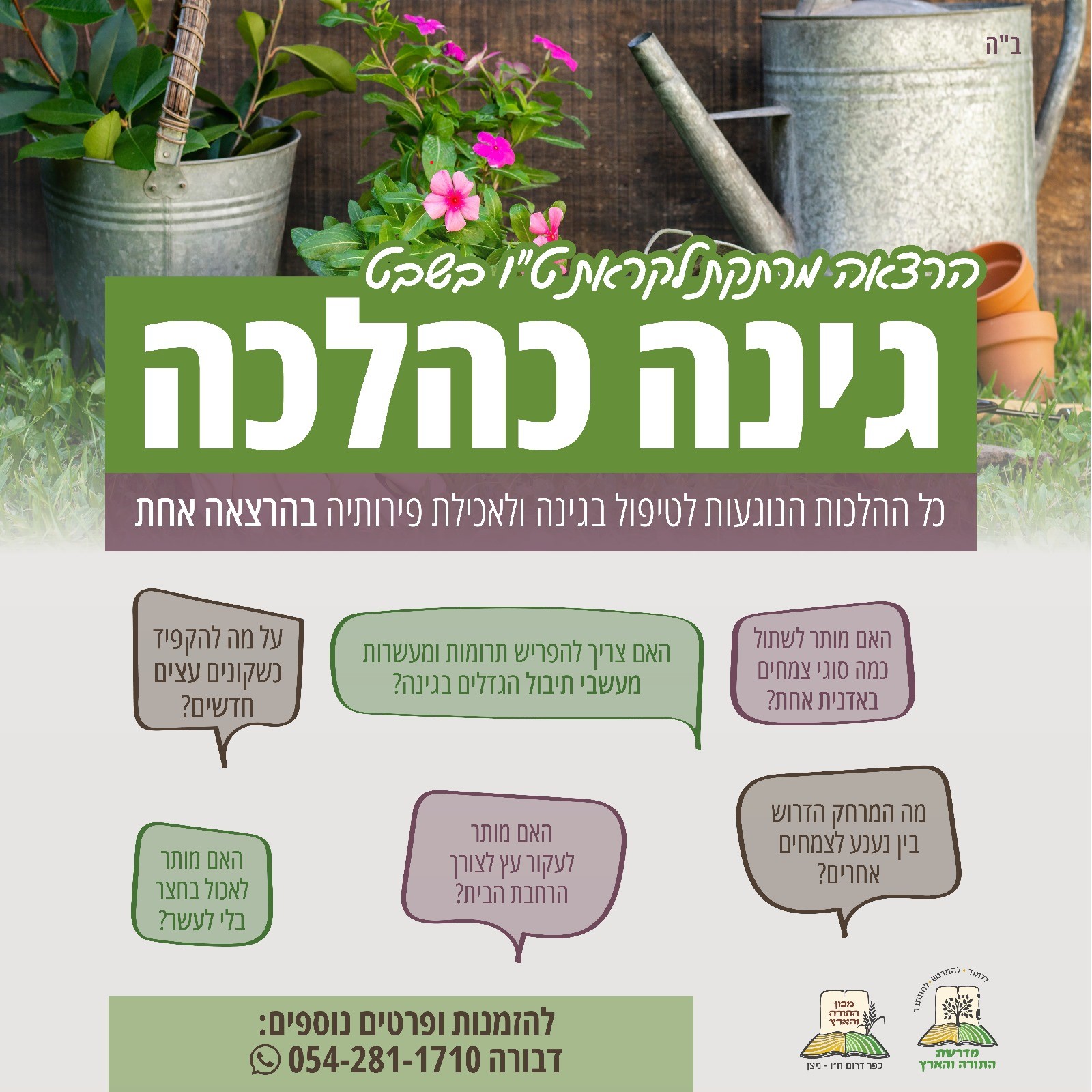 בשיעור זה נעסוק בתכנון הלכתי נכון של הגינה: מהם שתילים כשרים? אלו מינים מותר לשתול בסמוך וכמה צריך להרחיק? מה עושים עם גפן בגינה? ומתי מותר לעקור עצים?
