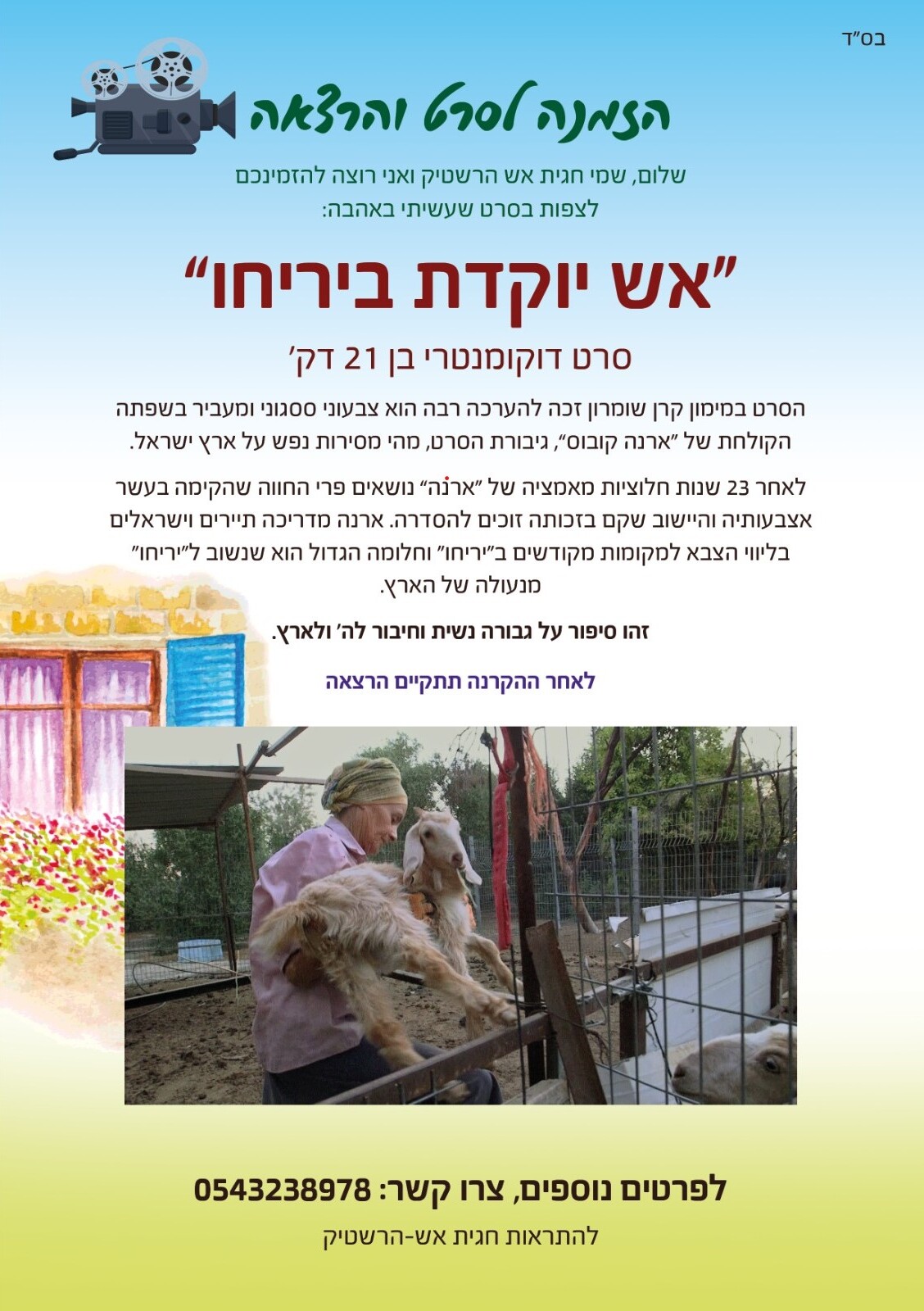 הקרנת הסרט הדוקומנטרי "אש יוקדת ביריחו" המספר את סיפורה של ארנה, דמות חד-פעמית שלימדה אותי שיעור בנחישות וכח רצון.