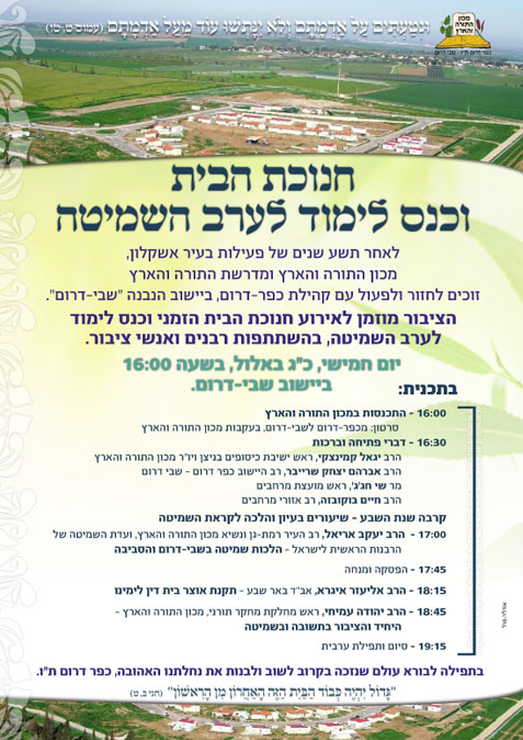 איך לטפל בגינה הפרטית? כיצד לקנות בשוק? איזו רלוונטיות יש לשמיטה בימינו? ערב לימוד מיוחד על השמיטה וערכיה בארץ ישראל...