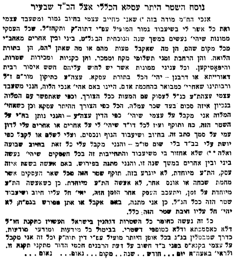 שכל איש מישראל כשיתחיל לעסוק במשא ומתן, יהיה עליו חיוב שיכתוב בכתב ידו פעם אחת אצל הרב דמתא שבכל עיר שכל העסקים שיעשה במעות, הן מה שיתן אף לאחרים והן מה שיקבל מאחרים מעיד הוא על עצמו שהוא על אופן עסקא עפ״י תקנת חז״ל אם ישכח או שלא יוכל לדבר מזה בפירוש בעת נתינת או לקיחת המעות ואיך שיתפשר אז יהי׳ על צד היתר עיסקא.