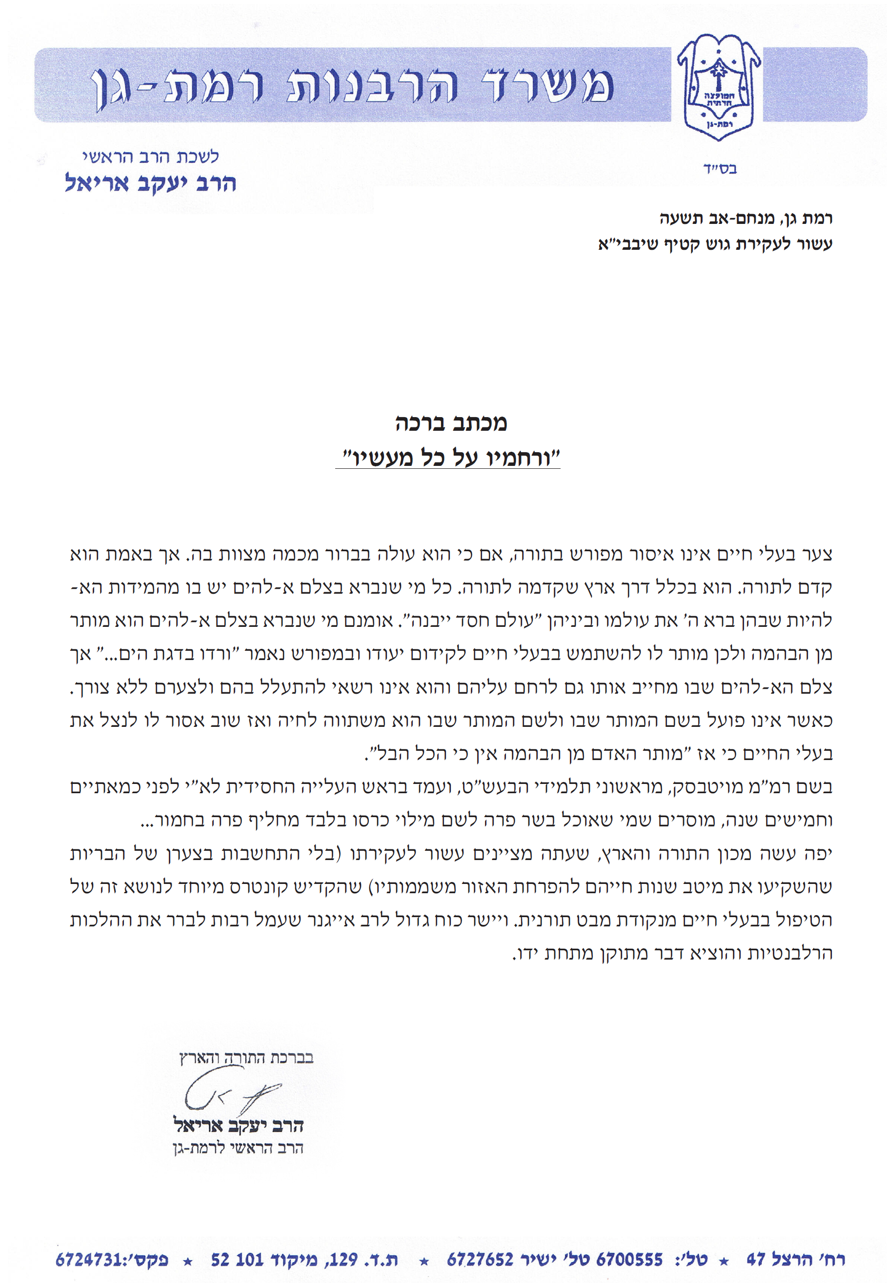 הסכמת הרה"ג יעקב אריאל לחוברת "על בשר ומוסר" -