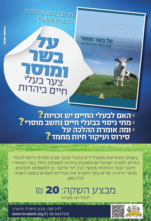 חדש מבית 'מכון התורה והארץ' - "על בשר ומוסר" - חוברת מיוחדת המוקדשת לנושא טיפול בבעלי חיים מנקודת מבט תורנית. החוברת, שנערכה על ידי הרב דוד אייגנר, מתעסקת בענייני הטיפול בבעלי חיים ובעניין צער בעל חיים והיבטיו וזכתה להסכמת וברכת הרה"ג יעקב אריאל שליט"א