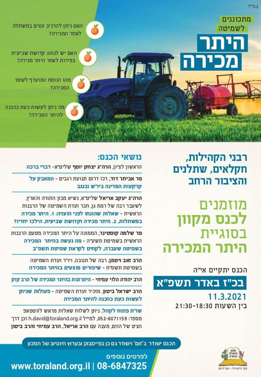 כחלק מפעילות המכון לקראת שנת השמיטה הקרובה התקיים כנס מקוון בסוגיית היתר המכירה, ביום חמישי כ"ז אדר תשפ"א (11.3.21). הכנס שודר בזום, בפייסבוק ובערוץ היוטיוב של המכון.