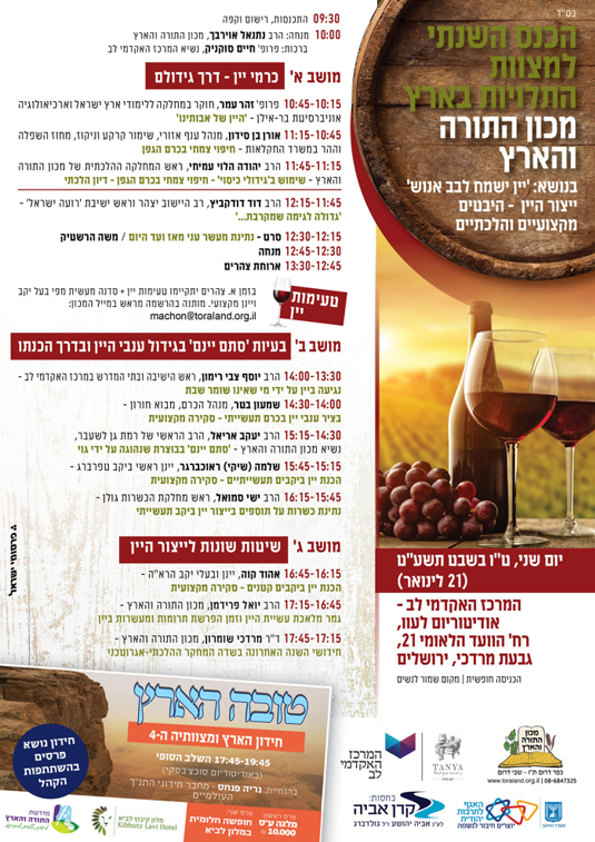 כמידי שנה, יערך בירושלים הכנס השנתי של מכון התורה והארץ, שיעסוק השנה בנושא "יין ישמח לבב אנוש" ייצור היין - היבטים מקצועיים והלכתיים.